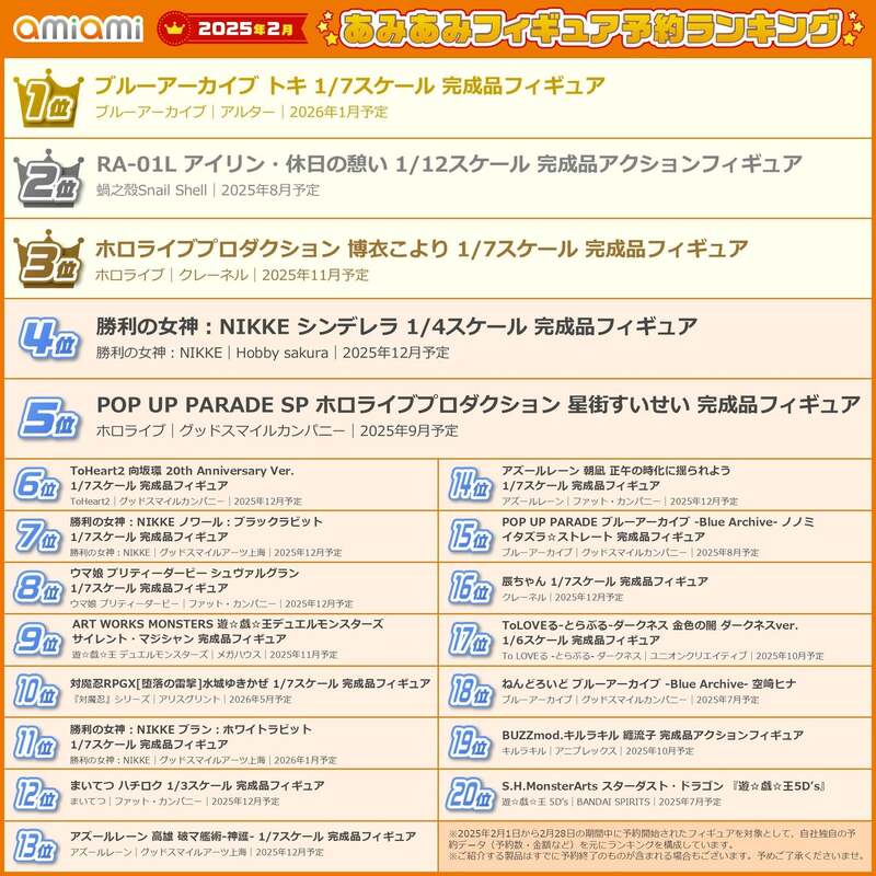 大網株式会社(東京都文京区)は、自社が運営するホビーショップ『あみあみ』の2025年2月フィギュア予約ランキングを発表いたしました。