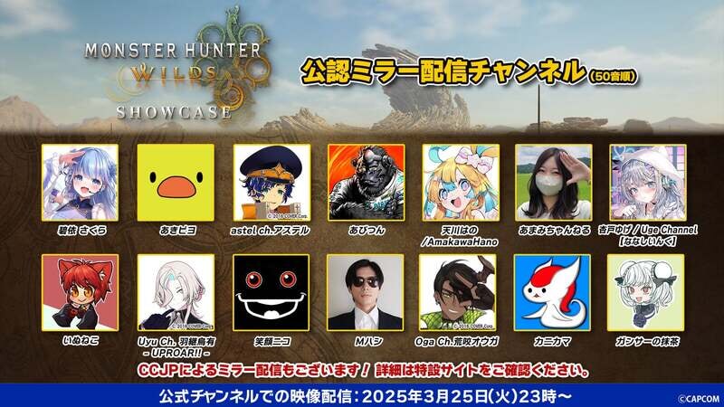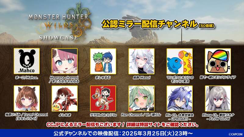「モンスターハンターワイルズ ショーケース」公認ミラー配信 YouTubeチャンネル(50音順)