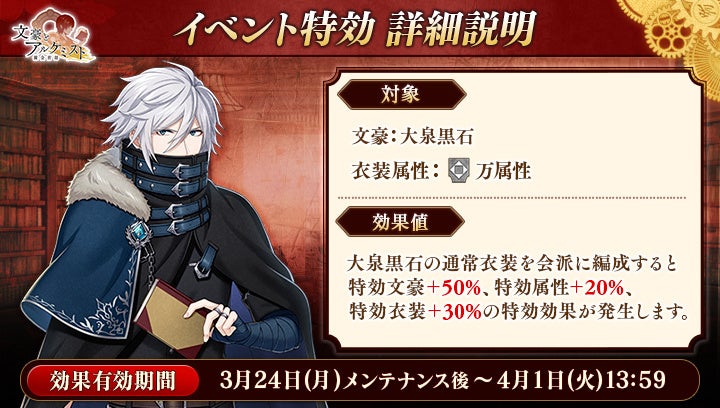期間中「大泉黒石」の通常衣装を編成して潜書すると、特効文豪50%、特効属性20%、特効衣装30%の特効効果が発動します。
