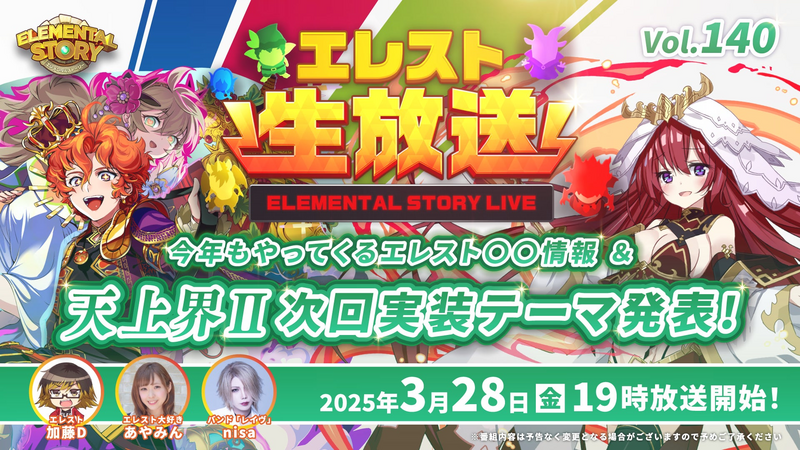 Studio Z株式会社(本社:東京都港区 代表取締役CEO: 古瀬 祥一)が運営しております 共闘対戦 爽快パズル消しゲー『エレメンタルストーリー』では、2025年3月28日(金)19:00より、Studio Z公式エレスト生放送vol.140を配信いたします。