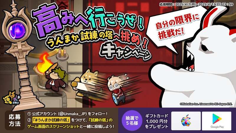 公式X( https://x.com/Unmaka_JP )をフォローして、4月7日のアップデートで登場した「試練の塔」をプレイしているゲーム画面のスクリーンショットと一緒に指定ハッシュタグ「 #うんまか試練の塔 」を添えてポストしていただいた方の中から抽選で5名様にApple Gift Card またはGoogle Playギフトカード 1,000円分(選択制)をプレゼントします。