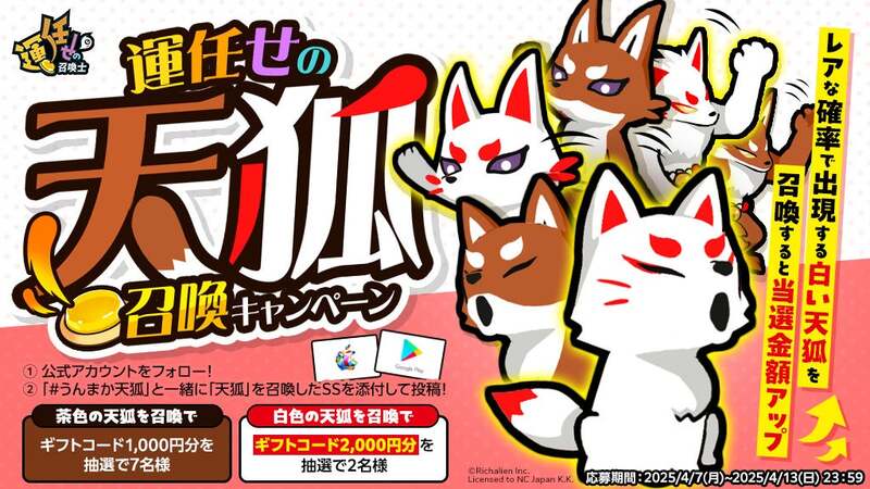 公式X( https://x.com/Unmaka_JP )をフォローして、4月7日のアップデートで登場した新召喚獣「天狐」を召喚しているゲーム画面のスクリーンショットと一緒に指定ハッシュタグ「 #うんまか天狐 」を添えてポストしていただいた方の中から抽選で7名様にApple Gift CardまたはGoogle Playギフトカード 1,000円分(選択制)をプレゼントします。