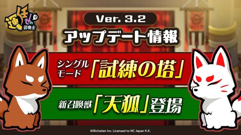 エヌ・シー・ジャパン株式会社(本社:東京都港区、代表取締役:林元基(イムウォンキ)、以下エヌシージャパン)は、カジュアルタワーディフェンスゲーム「運任せの召喚士」にて、2025年4月7日(月)に、シングルモード「試練の塔」、新召喚獣「天狐」の登場をお知らせします。