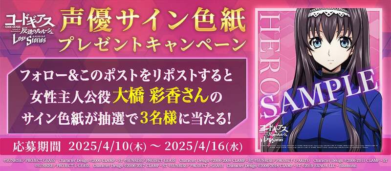 2025年4月10日、スマホ・PC向けゲーム『コードギアス ロストストーリーズ』でメインストーリー第3部7章が開幕しました。これを記念して、育成素材が獲得できる限定ミッションやログインボーナスなどの豪華キャンペーンを実施中です。さらに、新パイロット★4主人公とナディラが登場するピックアップスカウトも開催。声優サイン色紙が当たるキャンペーンも見逃せません。アニメの世界観を再現した迫力のバトルと新たな物語を楽しめる本作。今すぐダウンロードして、ルルーシュたちと共に戦いましょう!