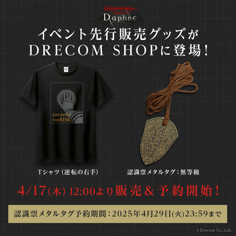 イベントにて先行販売された『Wizardry Variants Daphne』のグッズ「Tシャツ(逆転の右手)」の販売と「認識票メタルタグ:無等級」の予約受付が、2025年4月17日(木)正午よりドリコムの公式オンラインショップ「DRECOM SHOP(ドリコムショップ)」にて開始することが決定いたしました。
