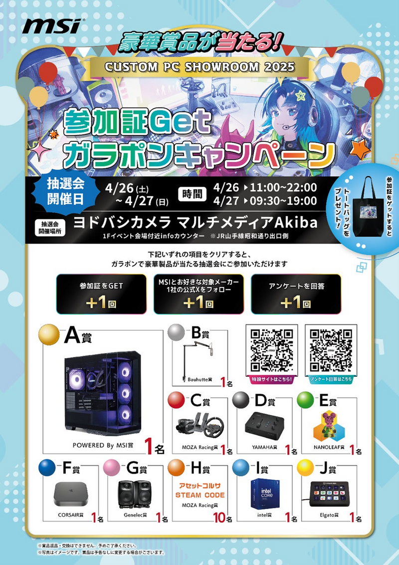 イベントにご来場いただき参加証をゲットした方には「カスタムPCショールーム2025限定オリジナルグッズバック」を1名様につき1点プレゼントいたします。さらに、本キャンペーンご参加した方は、ゲーミングPCなどの豪華製品が当たるガラポン抽選会にご参加いただけます。