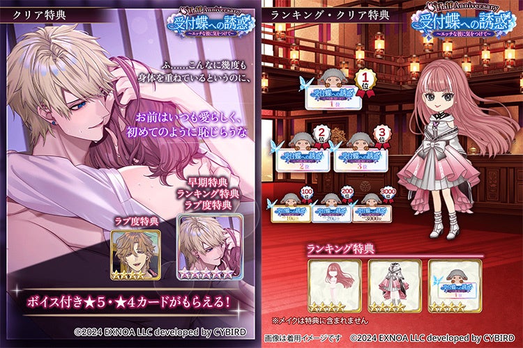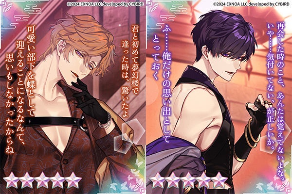 DMM GAMESを運営する合同会社EXNOA(本社:東京都港区、CEO:村中 悠介、URL:https://games.dmm.com/)は、オトナの女性向け恋愛ゲーム「夢幻楼と眠れぬ蝶」にて、新たなゲーム内イベントとガチャの開催をお知らせいたします。また、限定ステッカー2枚セットを抽選で10名様にプレゼントするゲーム内イベント連動キャンペーンの開催もお知らせいたします。