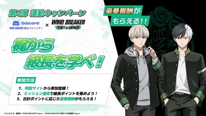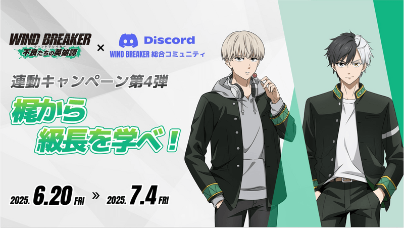 Discordコミュニティの企画・運営支援を行うナイル株式会社(本社:東京都品川区、代表取締役社長:高橋飛翔、以下ナイル)は、株式会社講談社(本社:東京都文京区、代表取締役社長:野間省伸)が提供するTVアニメ『WIND BREAKER』を題材としたオンラインゲーム『WIND BREAKER 不良たちの英雄譚』(略称、『ウィンヒロ』)とWIND BREAKER 総合コミュニティによる第4弾連動キャンペーン「梶から級長を学べ!」を6月20日より開催いたします。